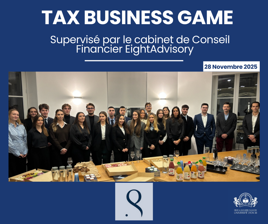 Le vendredi 28 novembre, les étudiants du Master 2 ont eu l’opportunité de participer à la première édition lyonnaise du Tax Business Game, organisée par le cabinet Eight Advisory Société d’Avocats.