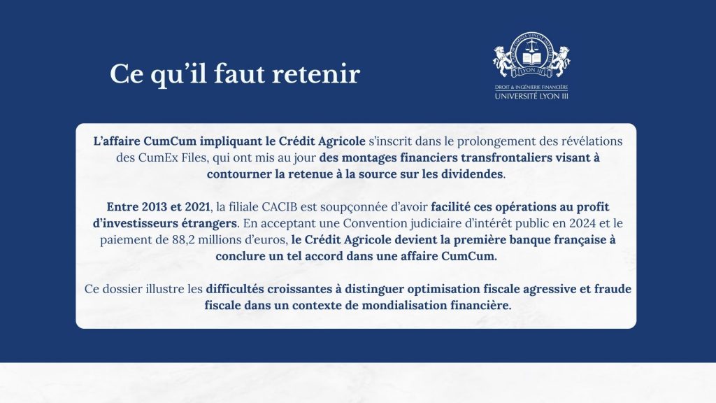 - Clara Pélégry (M2) et Pauline Boisson (M1) ont ensuite analysé l’affaire dite « CumCum » impliquant le Crédit Agricole, en exposant les mécanismes fiscaux en cause et les réponses apportées par les autorités.