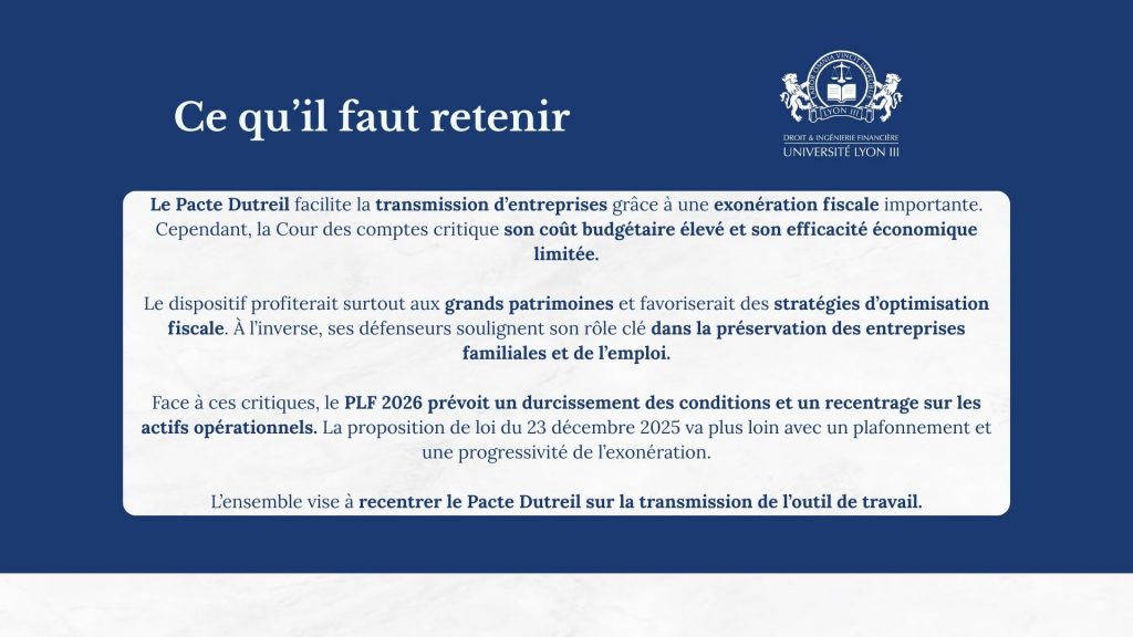 - Pauline Reille (M2) et Antonin Monce (M1) ont poursuivi avec une intervention relative au Pacte Dutreil face au projet de loi de finances pour 2026, s’interrogeant sur un éventuel durcissement du dispositif et ses conséquences pour la transmission des entreprises.