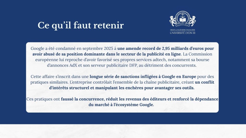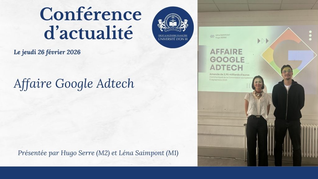 • Hugo Serre (M2) et Léna Saimpont (M1) ont ensuite analysé la condamnation record infligée à Google pour abus de position dominante dans la publicité en ligne, illustrant les effets anticoncurrentiels d’un écosystème adtech entièrement contrôlé par l’entreprise
