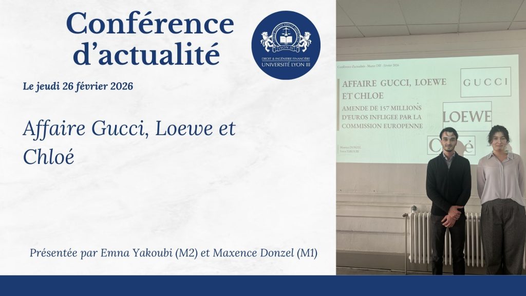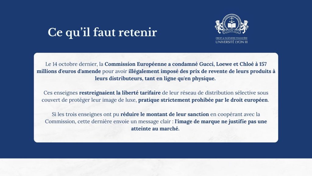 • Enfin, Emna Yakoubi (M2) et Maxence Donzel (M1) ont conclu ces conférences par une présentation portant sur la condamnation de Gucci, Loewe et Chloé pour avoir imposé illégalement des prix de revente à leurs distributeurs, une pratique sanctionnée par une amende de 157 millions d’euros malgré leur coopération avec la Commission.