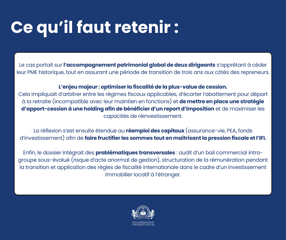 Leur étude portait sur l’accompagnement patrimonial global de deux dirigeants s’apprêtant à céder leur PME historique, tout en poursuivant leur activité aux côtés des repreneurs pendant une période de transition de trois ans.